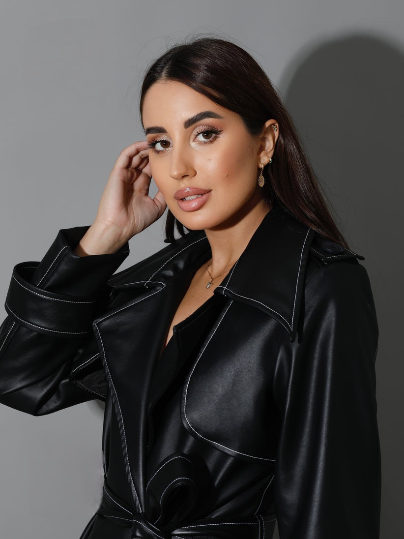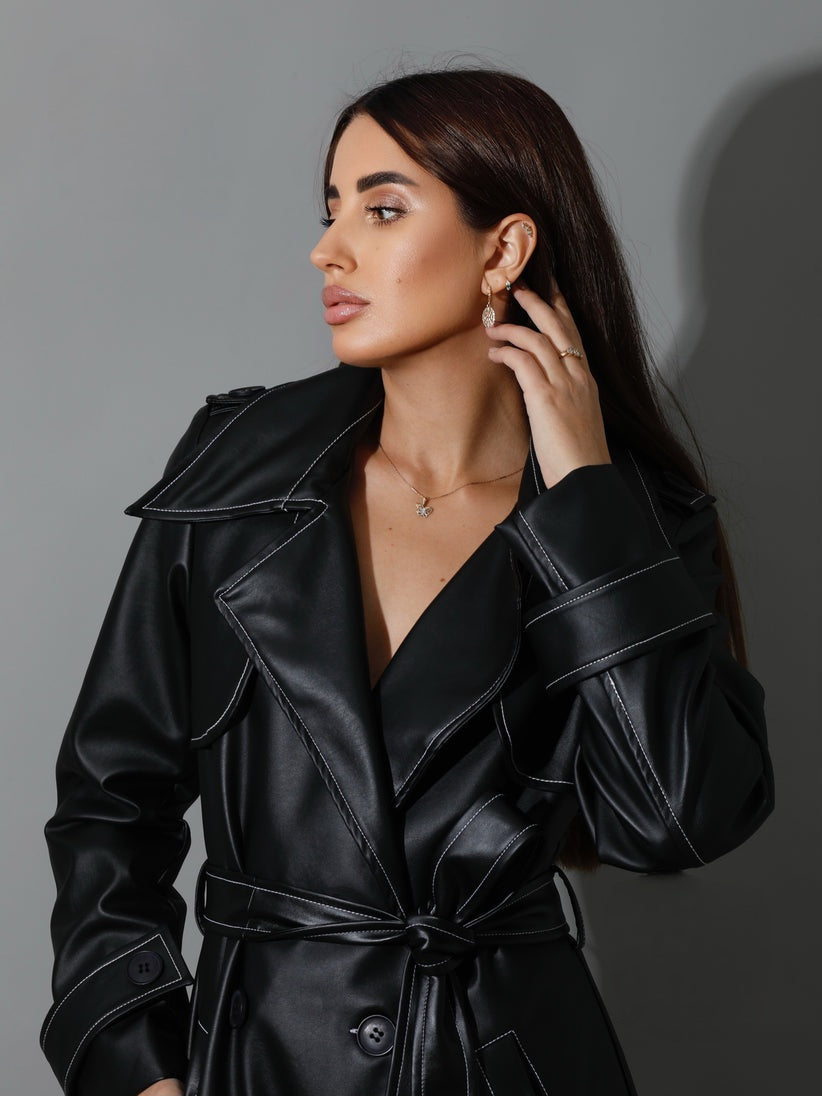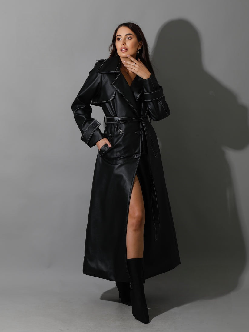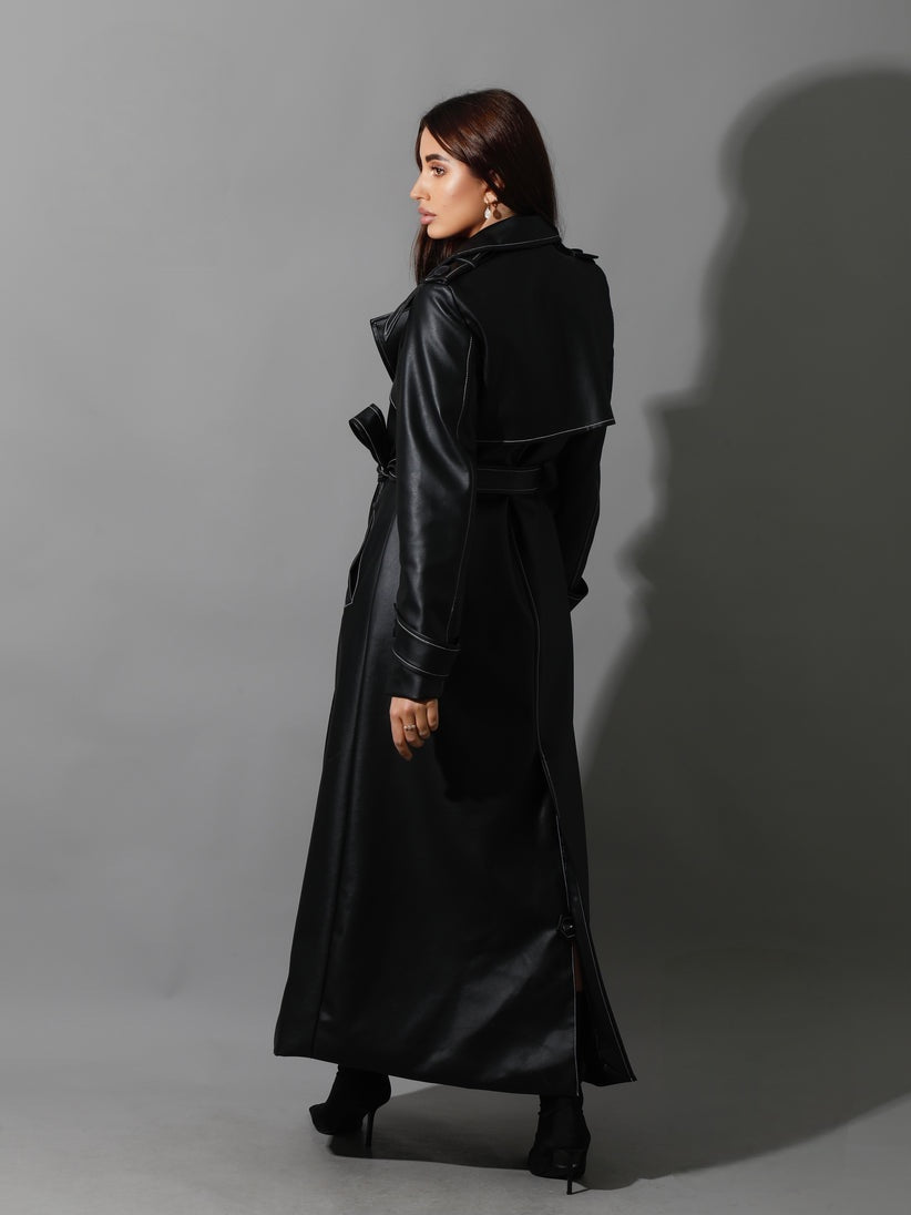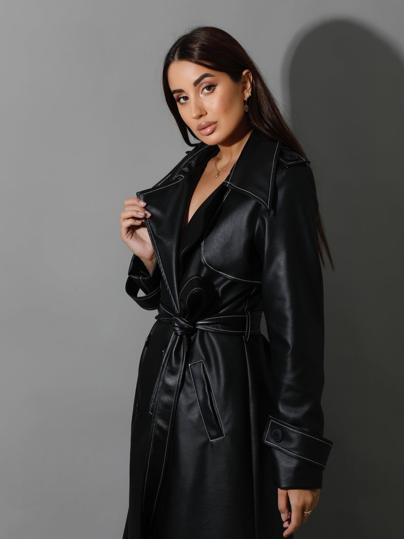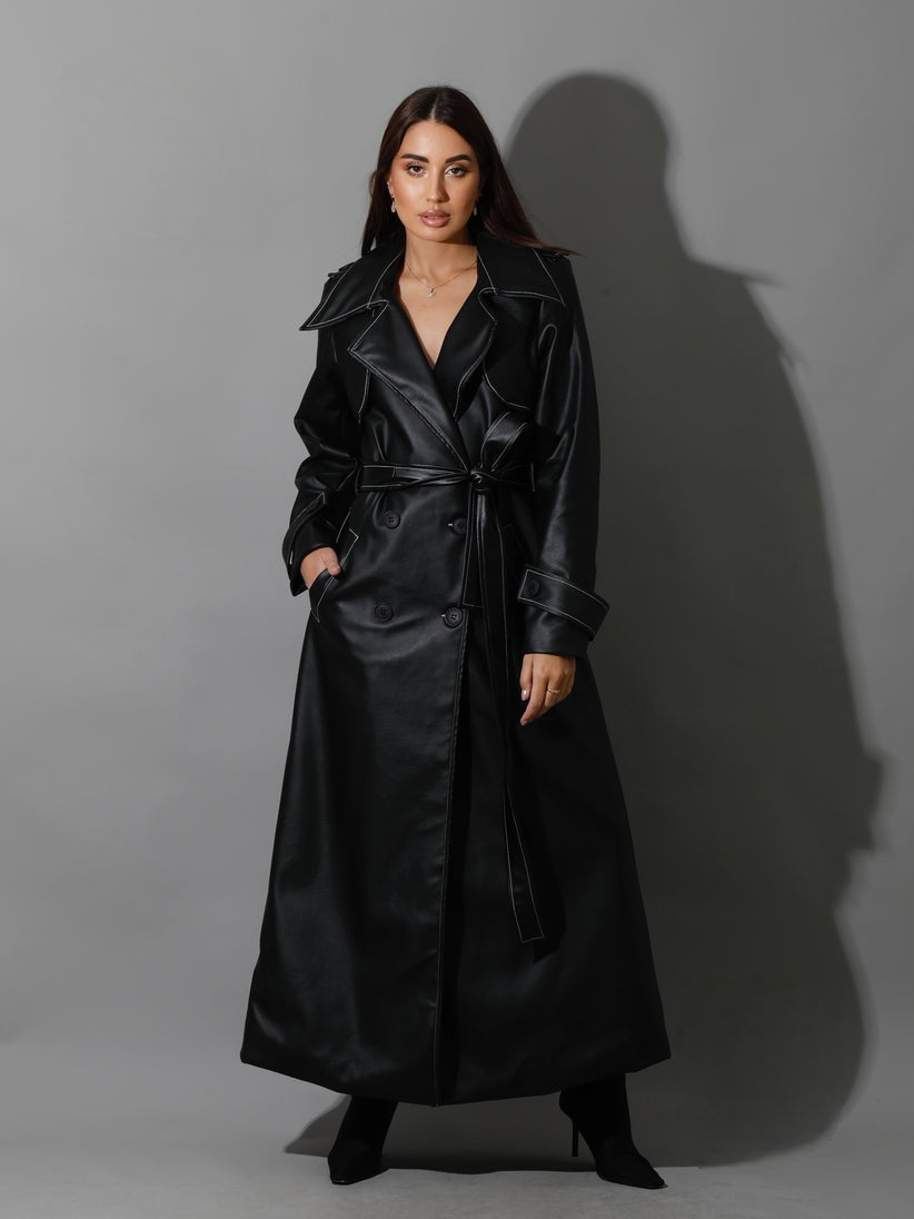 Black Leather Trench Coat With White Stitch -