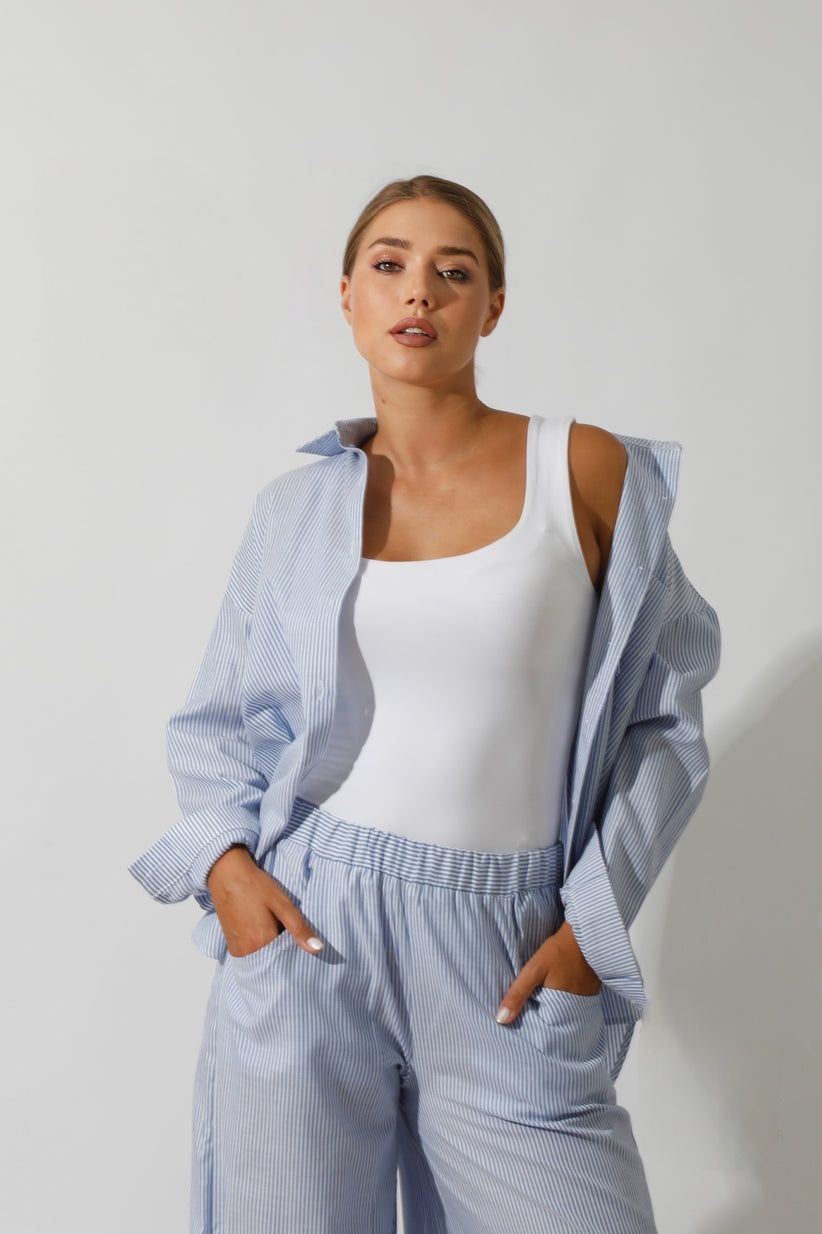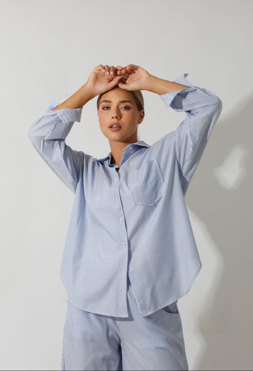 A perfect combination of style and comfort, the Lose fit- Stripped Blue set is a must-have for any fashion-forward individual. The co-ord lose fit shirt and wide leg pants offer a relaxed fit, while the striped blue design adds a touch of sophistication. Update your wardrobe with this effortlessly chic set.